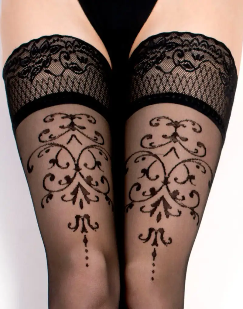 De zwarte kleur van de kousen zorgt voor een strakke en tijdloze uitstraling. Het zwarte borduursel op de dijen en voeten dient als decoratief element en accentueert de uitstraling van de benen. De combinatie van materialen heeft een uitzonderlijke esthetische uitstraling en zorgt voor comfort en draagplezier.