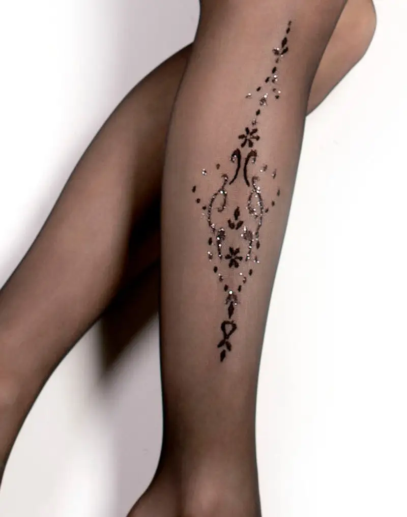 De zwarte kleur van de kousen zorgt voor een strakke en tijdloze uitstraling. Het zwarte borduursel op de achterkant van de benen dient als decoratief element en accentueert de uitstraling van de pijpen. De combinatie van materialen heeft een uitzonderlijke esthetische uistraling en zorgt voor comfort en draagplezier.