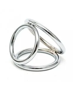 Rimba Cock Play metalen triangel voor penis en ballen. De drie solide metalen ringen hebben verschillende inwendige afmetingen Γ 40-45-50 mm.