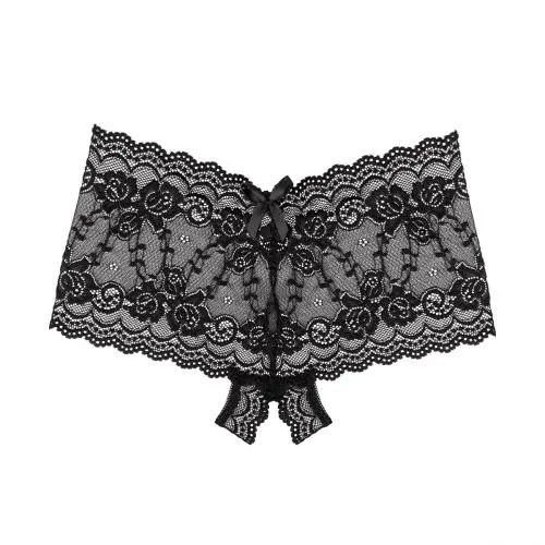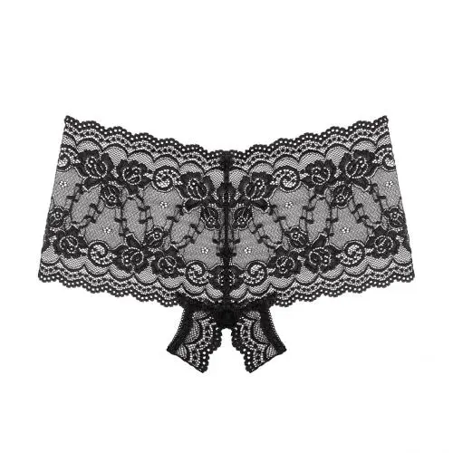 Deze sexy kanten short heeft een mooie pasvorm en een open kruisje. De short is geheel transparant en valt middelhoog.